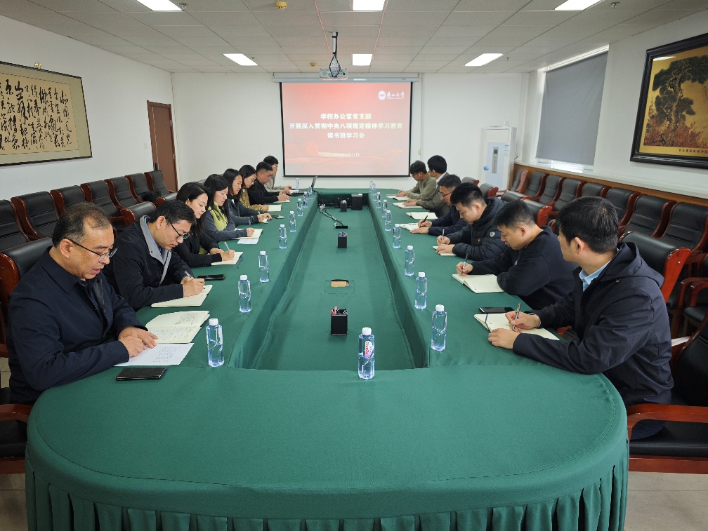4月11日上午,学校办公室党支部在世纪楼1910会议室开展深入贯彻中央八项规定精神学习教育读书班第一次集中学习。会议由党支部书记孙利主持,全体党员参会。