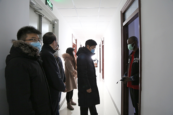 【新闻中心讯】2月2日上午,校长赵丁选、校党委副书记谢延安和副校长于树江一行,先后到东、西校区校医院、西校区13组团、学校3号门(文昌路门)对新型冠状病毒感染的肺炎疫情防控工作进行检查督导,慰问一线工作人员。学校办公室、安全工作处、国际教育学院、后勤服务中心等部门负责人陪同检查。