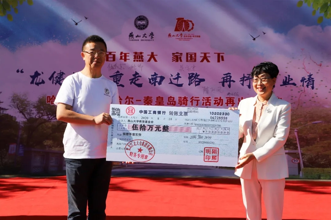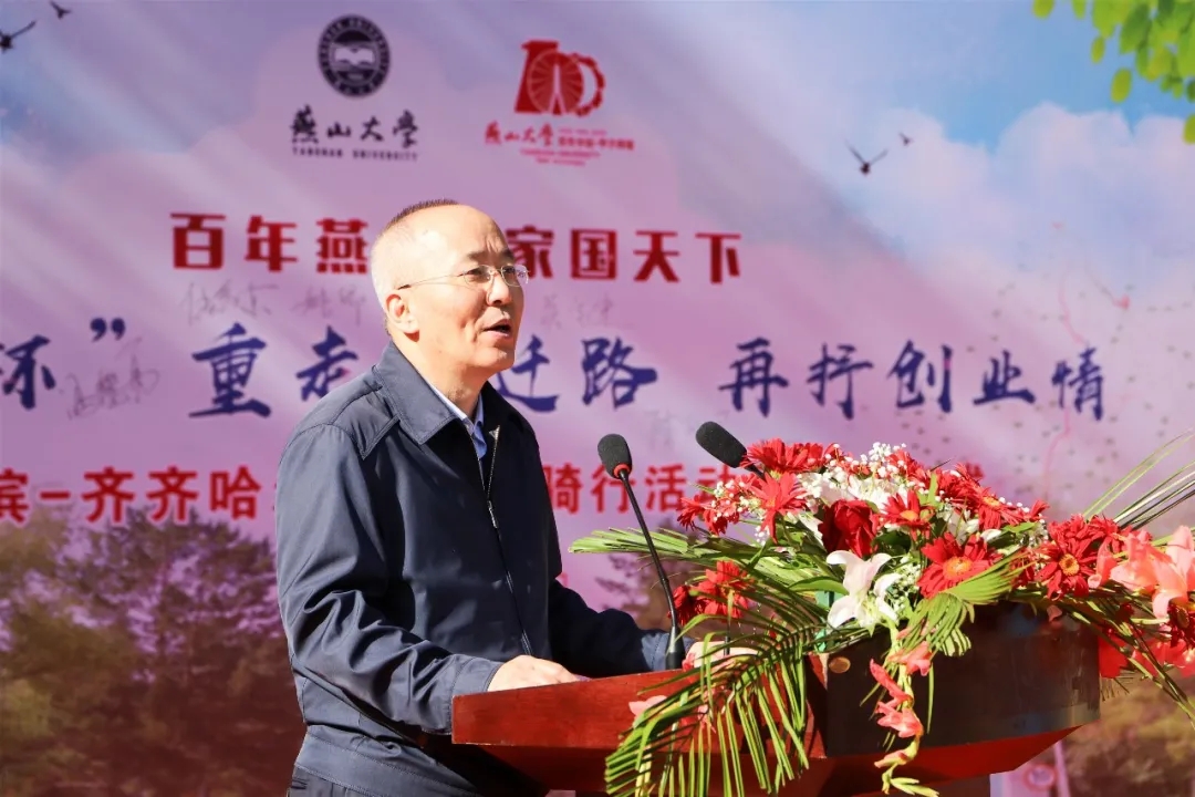 鲁云鹏代表全程骑手发言,他说这一段旅程,让他看到了各地校友的热情,那是一种深深的归属感,远在燕大千里,仍能看到家人。当然,这更是一种荣誉感,燕大培养的优秀人才,遍布各地,在自己的工作岗位上,发光发热。这一段旅程更深深地让他感受到了,学校搬迁的漫长旅程、创业过程的艰辛,骑行路上虽然是高低起伏,沟沟坎坎,他告诉自己一定要坚持一路向前。
