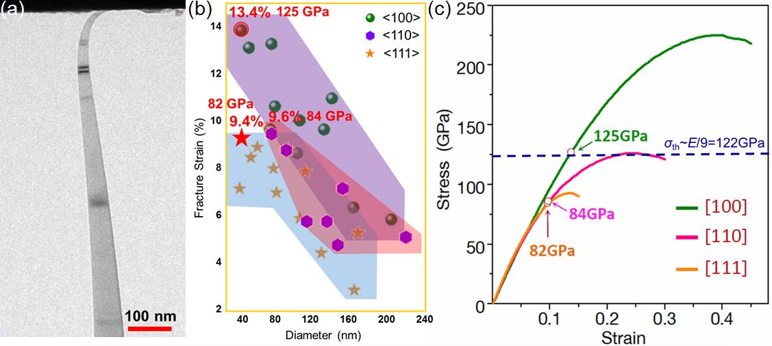 (a)金刚石弯曲TEM照片;(b)金刚石纳米针断裂应变对尺寸和取向的依赖关系;(c)金刚石理想应力-应变曲线